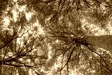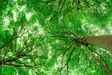 Bottom view of tree trunk to green leaves of tree in tropical forest. Fresh environment in park. Green plant give oxygen in summer garden. Forest is lung for human concept. Breath fresh air concept.