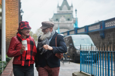 Happy senior retired couple walking outdoor around London - Focus on faces