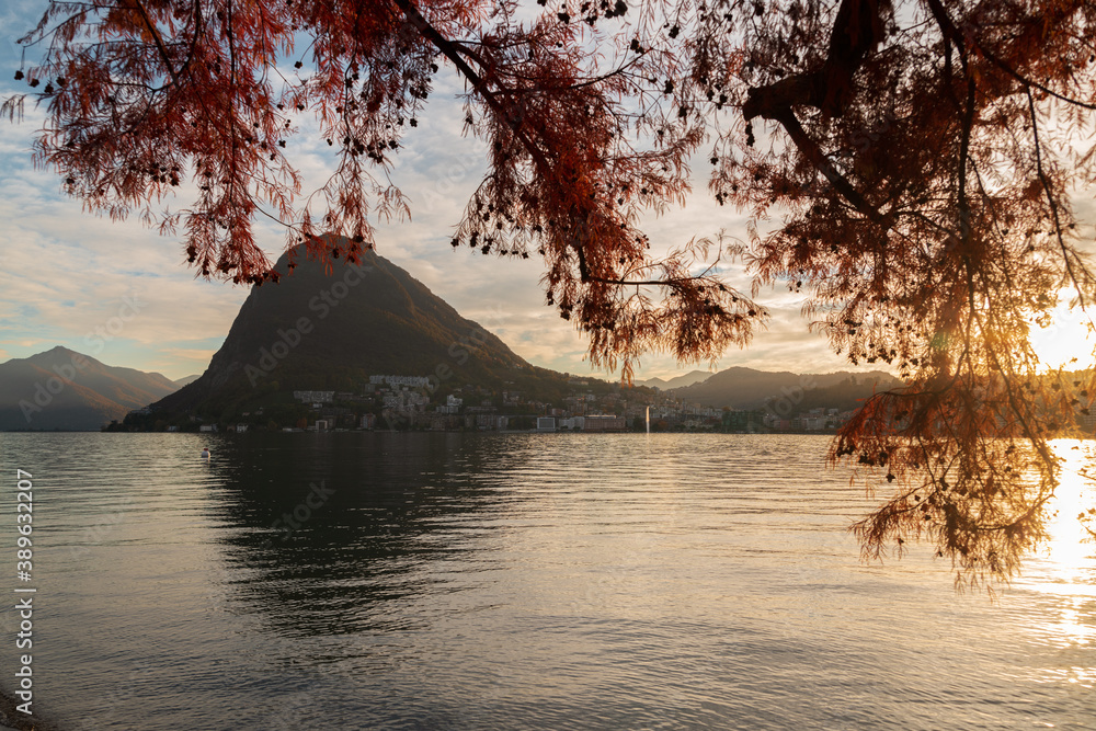 Panorama of Lake Lugano and Monte San Salvatore in the background.