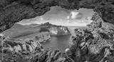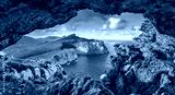 Astonishing summer view of Caccia cape from the small cave in the cliff. Fabulous morning scene of Sardinia island, Italy, Europe. Aerial Mediterranean seascape. Beauty of nature concept background.