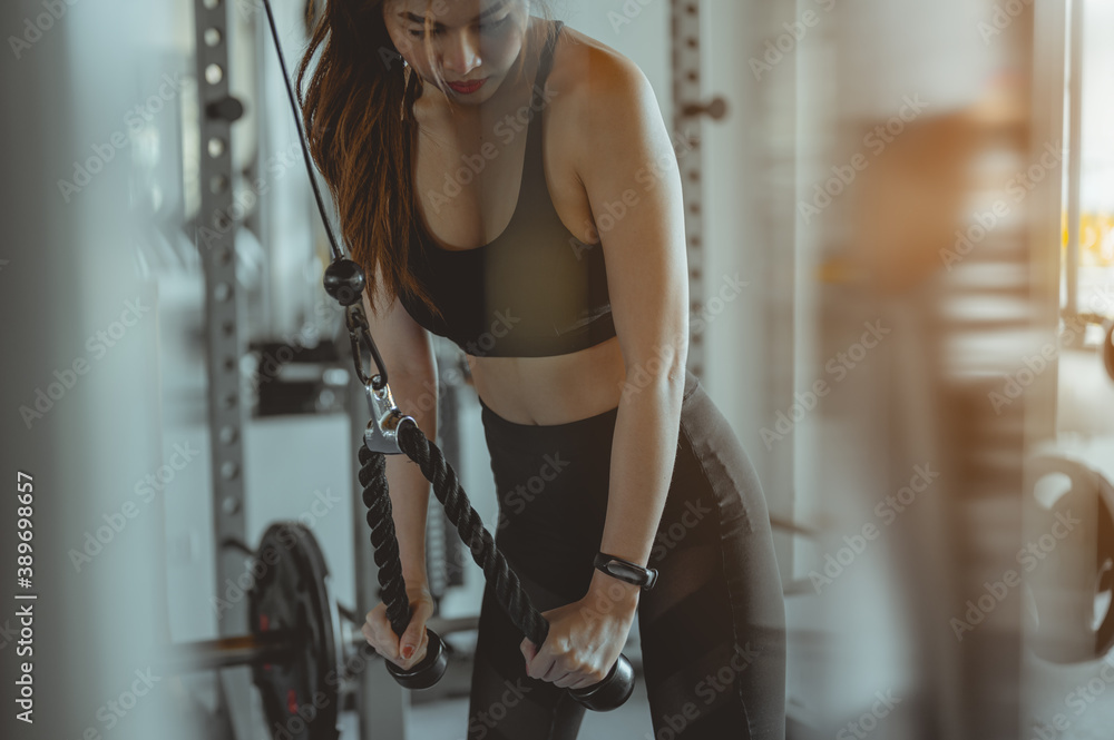 A women working out training arms in gym gaining weight pumping up muscles with dumbbells and on machines fitness concept..Fitness ,workout, gym exercise ,lifestyle and healthy concept.