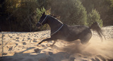beautiful black Arabian horse running on sand dune through the sunlight