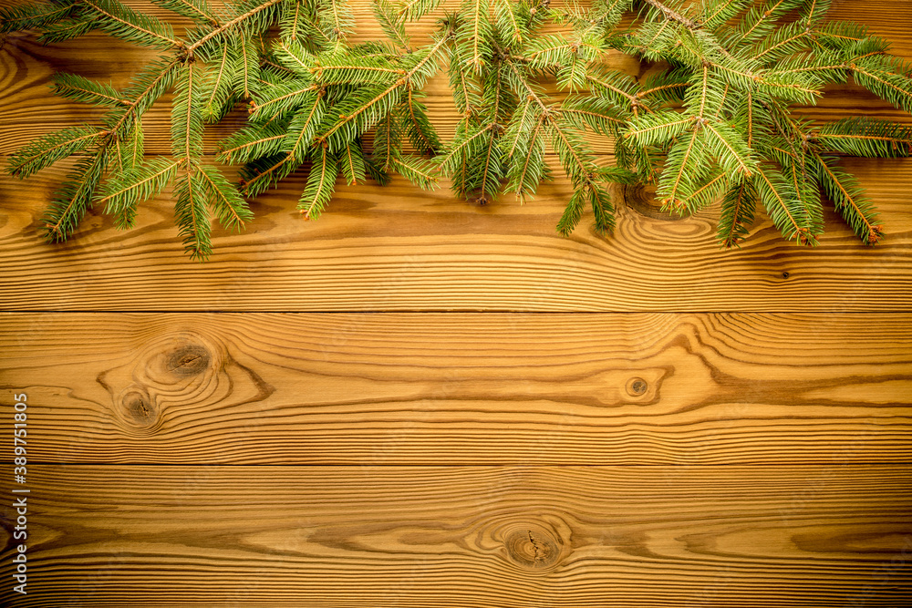 Christmas background with branches of a christmas tree on a wooden board. New year Greeting card.Flat lay.Copy space