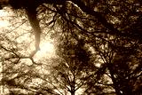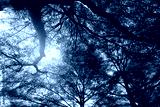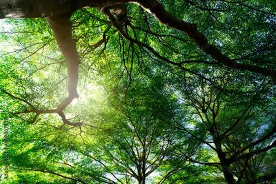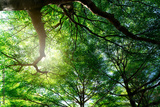 Bottom view of tree trunk to green leaves of tree in tropical forest. Fresh environment in park. Green plant give oxygen in summer garden. Forest is lung for human concept. Breath fresh air concept.