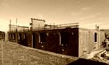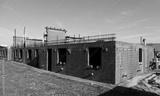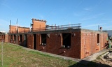 House under construction with only the first floor finished and the bricks exposed. Copy space.