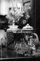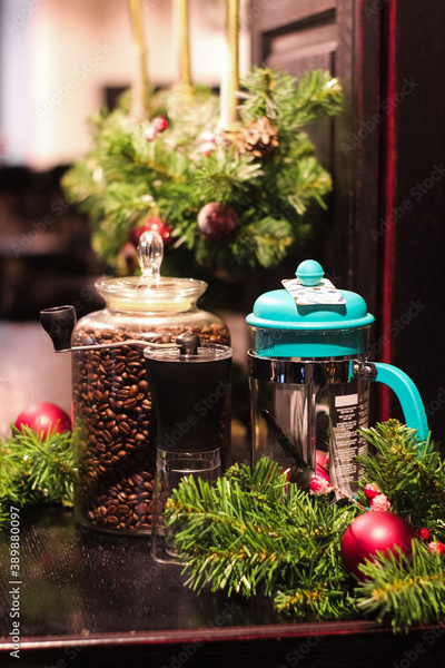 Vertical christmas still life composition on a dark wood background with coffee beans in a glass jar along with a french press and a coffee grinder surrounded by pine branches decorated with red balls