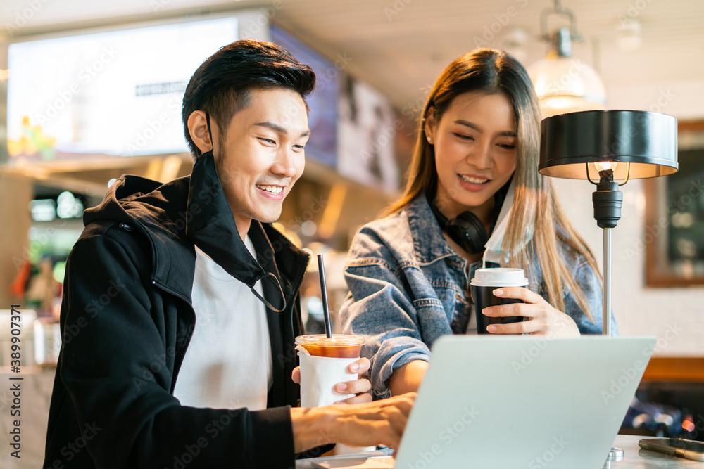 asian couple wear face mask virus protection and surfing internet on laptop in coffee shop at terminal airport.Young man and woman laugh and smile together use touch screen computer in lounge airport