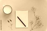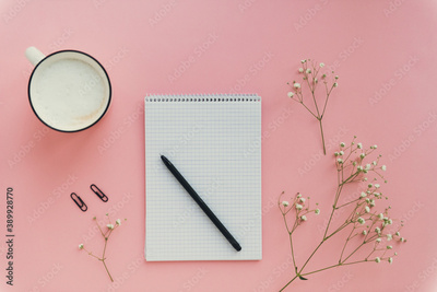 open notepad with pen, coffee cup and flowers flat lay. Woman wish list or planner.