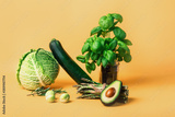 Abstract composition with fresh vegetables of cabbage, zucchini, asparagus, Brussels sprouts, avocado, basil on orange background. Vegetarian and vegan diet. Sustainable lifestyle, plantbased food.