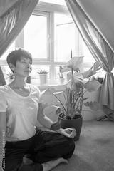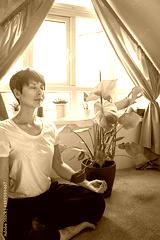 Woman practicing meditation sitting at cozy space with green plants near the window. Taking a break time for a minute, self-healing, and mindfulness. Mental health practice.