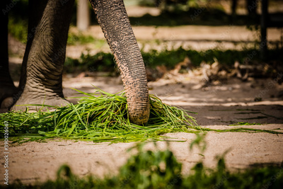 Close up an elephant truck holding green grass for eat in vintage style background