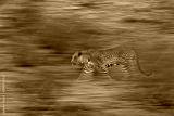 Artistic photo of African leopard, Panthera pardus, expressing movement by camera panning techniques. Motion blur of wild leopard in Kgalagadi desert in Africa. Art wildlife nature, cat in wilderness.
