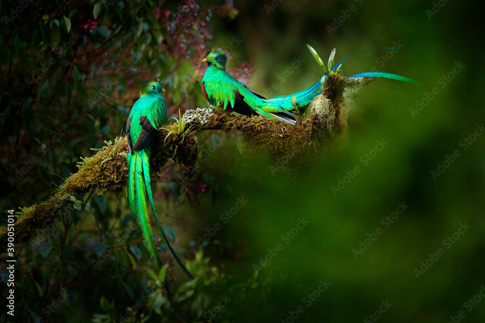 Quetzal, Pharomachrus mocinno, from nature Costa Rica with pink flower forest. Magnificent sacred mystic green and red bird. Resplendent Quetzal in jungle habitat. Wildlife scene from Costa Rica.