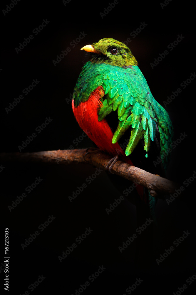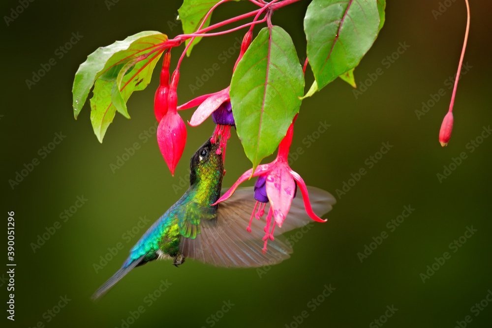Wildlife in tropic mountain forest. Shiny glossy Fiery-throated Hummingbird, Panterpe insignis, shiny colorful bird in flight. Wildlife flight action scene from tropical forest in dark habitat.