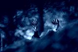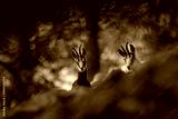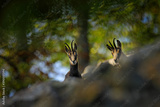 Chamois, Rupicapra rupicapra, on the rocky hill, forest in background, Studenec hill, Czech Republic. Wildlife scene with horn animal, Chamois. Forest landscape with chamois.