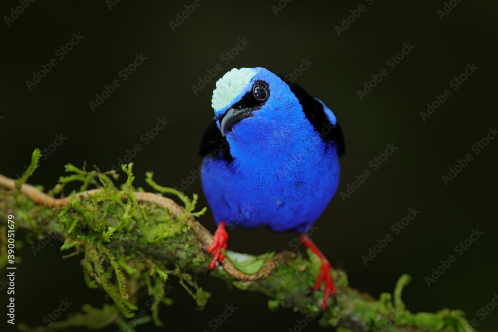 Red-legged Honeycreeper, Cyanerpes cyaneus, exotic tropical blue bird with red legs from Costa Rica. Tinny songbird in the nature habitat. Tanager birdwatching in South America.