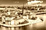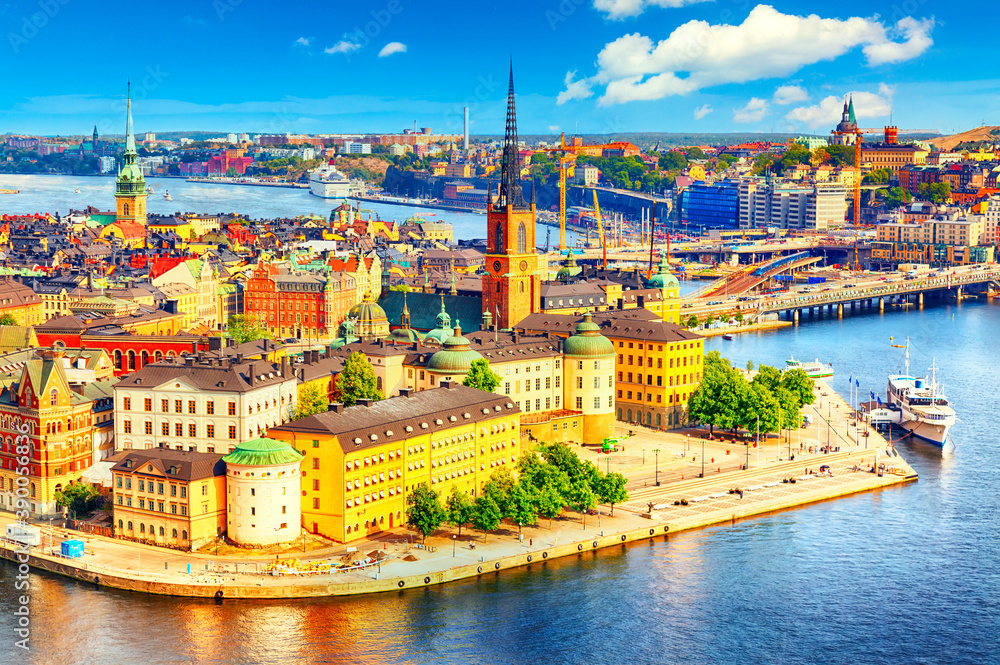 Beautiful aerial view of Stockholm Old town Gamla Stan from the City Hall Stadshuset. Beautiful summer sunny day in Stockholm, Sweden.