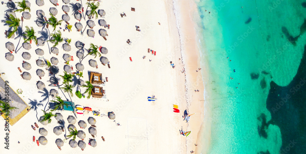 Beach vacation and travel background. Aerial drone view of beautiful atlantic tropical beach with straw umbrellas, palms and boats. Bavaro beach, Punta Cana, Dominican Republic.