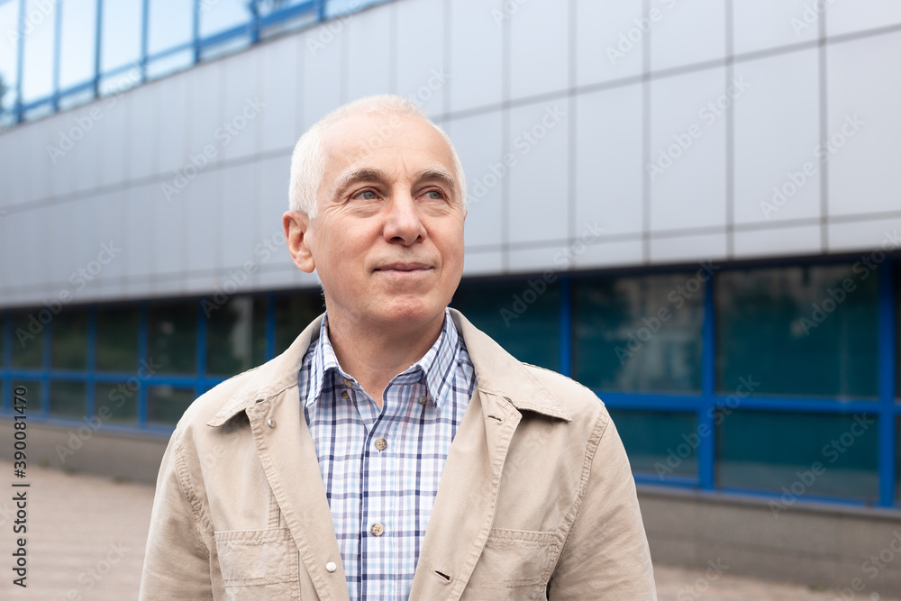 Smiling handsome mature businessman in casual outfit standing on city street
