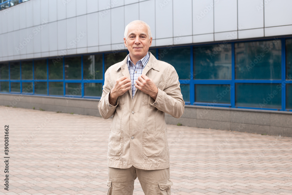 Portrait of cheerful senior businessman in casual outfit standing on city street