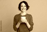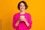 Portrait of satisfied cute lovely girl drink coffee cup wear pullover isolated over vivid color background
