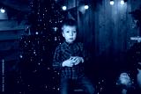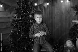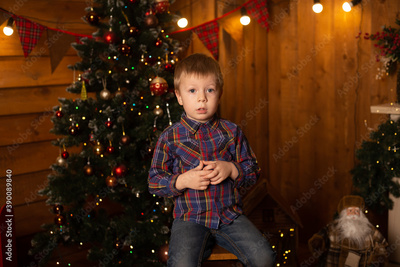 Portrait of confused boy sitting near Christmas tree. Merry Christmas and Happy New Year.