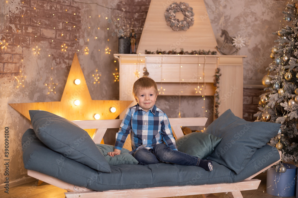 Merry Christmas and Happy New Year. Little cute boy at festive decorated home near fireplace and Christmas tree.
