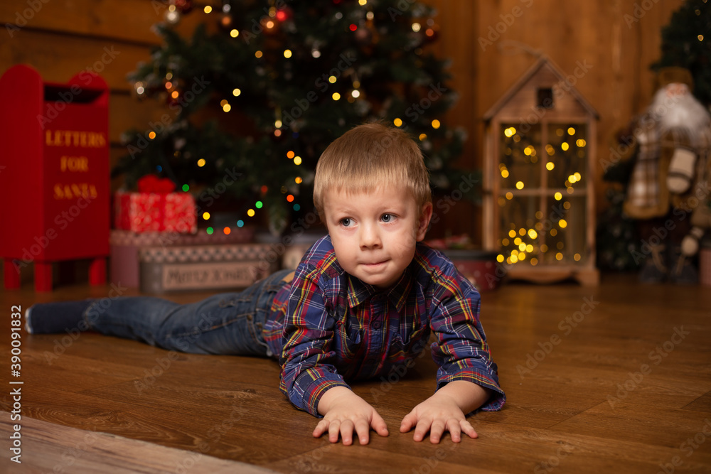 Cute little boy near tree decorated for Christmas. Merry Christmas and Happy New Year.