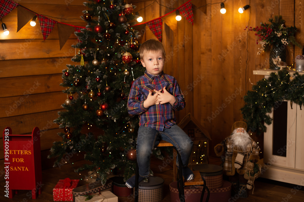 Little boy at home. New Year, winter and holidays seasons concept.