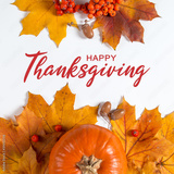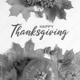 Thanksgiving greetings. Dry yellow leaves, pumpkins, berries on a white background, top view. Kaligraphic capital inscription.