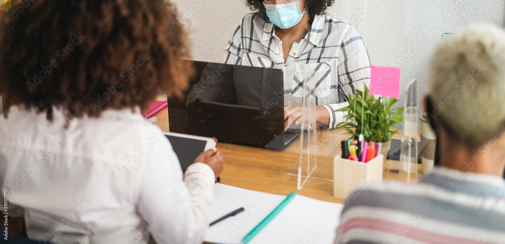 Young people working inside coworking office while wearing protective masks for coronavirus spread prevention - Social distance concept - Soft focus on woman face