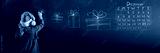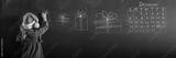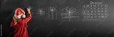 Girl in santa claus hat draws christmas drawing on the blackboard