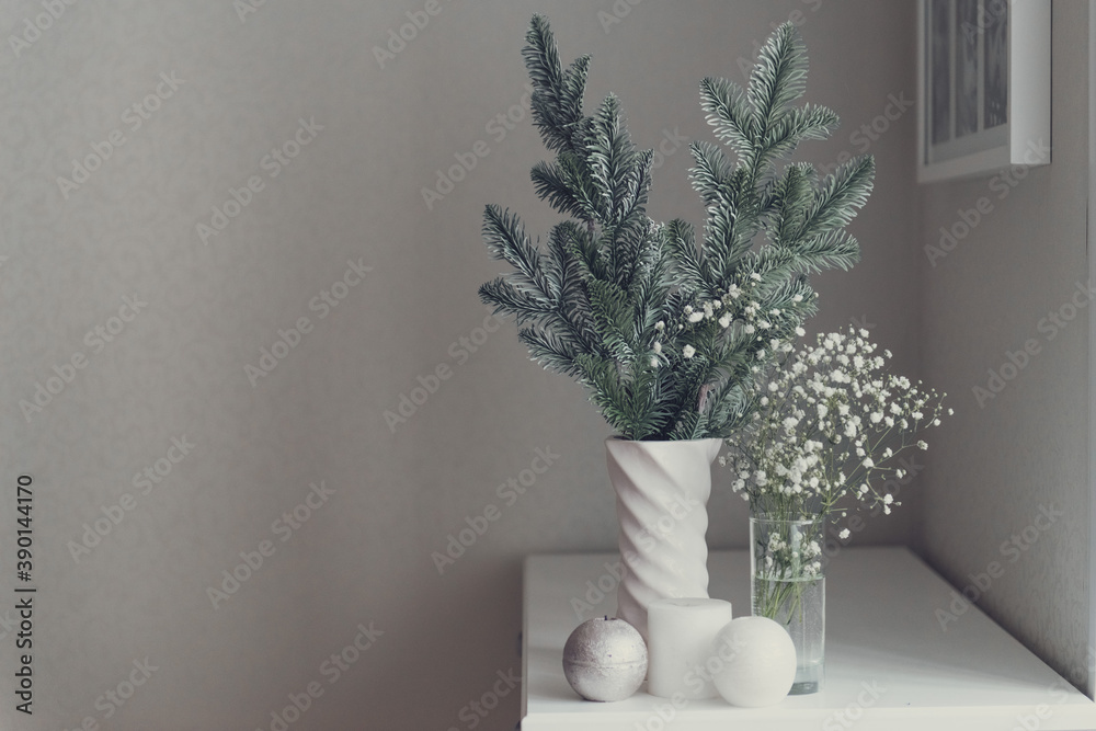 new year decor minimalistic composition of fir tree branches and gypsophila in vase