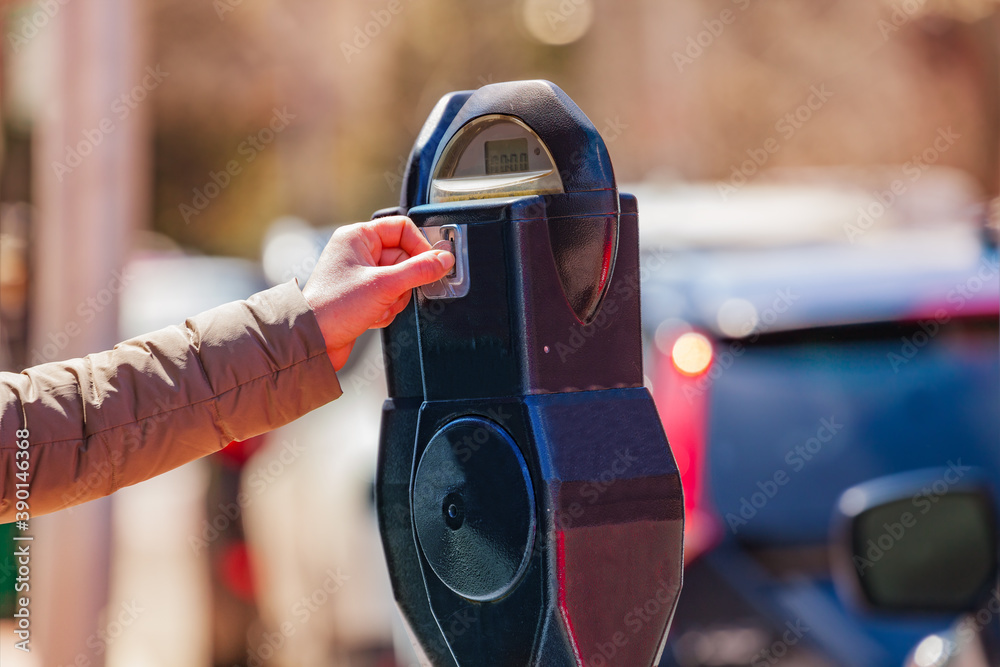 Woman pay on street parking meter pole in the USA city