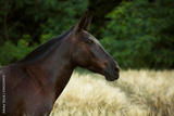 adorable dark brown mule with long ears standing in wheat golden field by the sunset