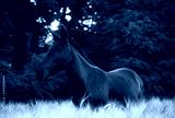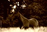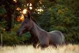 adorable dark brown mule with long ears standing in wheat golden field by the sunset