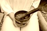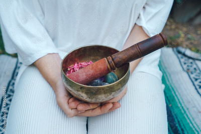 playing tibetan singing bowl whit a lot of plant as background