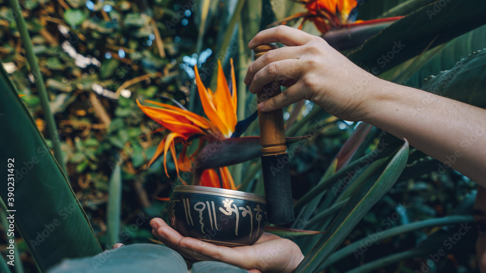 playing tibetan singing bowl whit a lot of plant as background