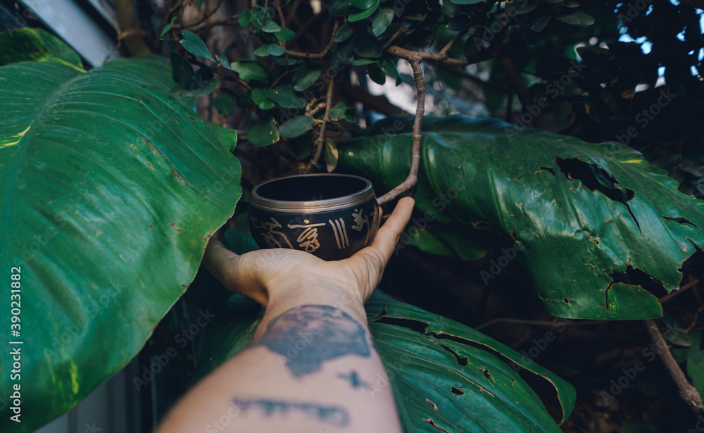 handheld of tibetan singin bowl , plants as background