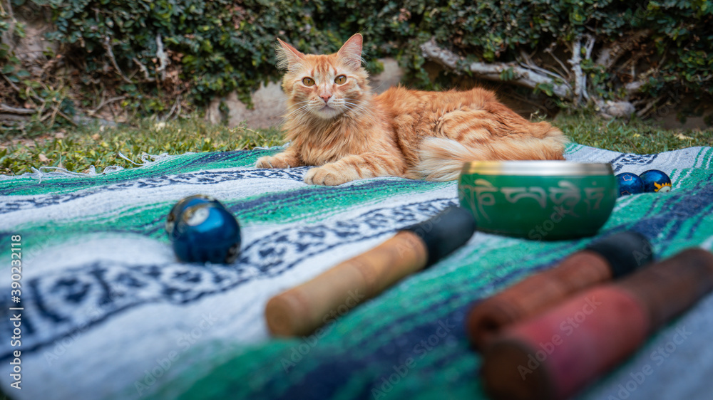 fluffy orange cat relaxing in the sound healing session and yoga practises