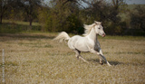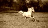 Beautiful white Arabian horse with long mane running through dreamy dandelion meadow
