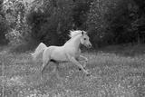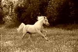 Beautiful white Arabian horse with long mane running through dreamy dandelion meadow