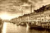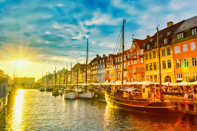 Copenhagen iconic view. Famous old Nyhavn port in the center of Copenhagen, Denmark during sunset