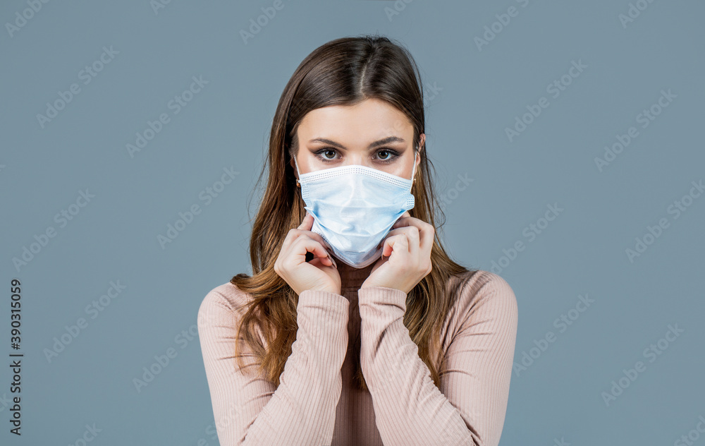 Girl Wearing Protective Mask. Woman wearing surgical mask for corona virus. Woman wearing an anti virus protection mask. Woman wearing medical face mask