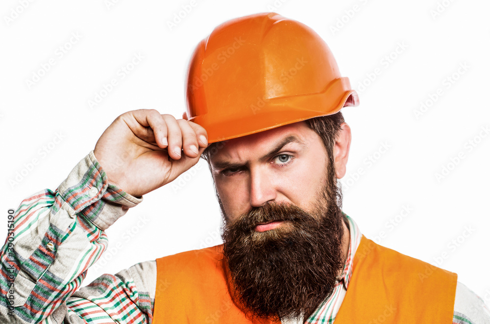 Builder in hard hat, foreman or repairman in the helmet. Bearded man worker with beard in building helmet or hard hat