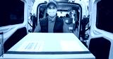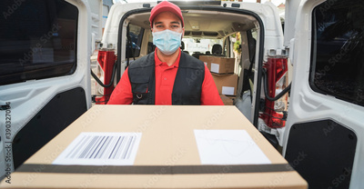Courier delivering packages with truck while wearing protective face mask for coronavirus prevention - Focus on man worker