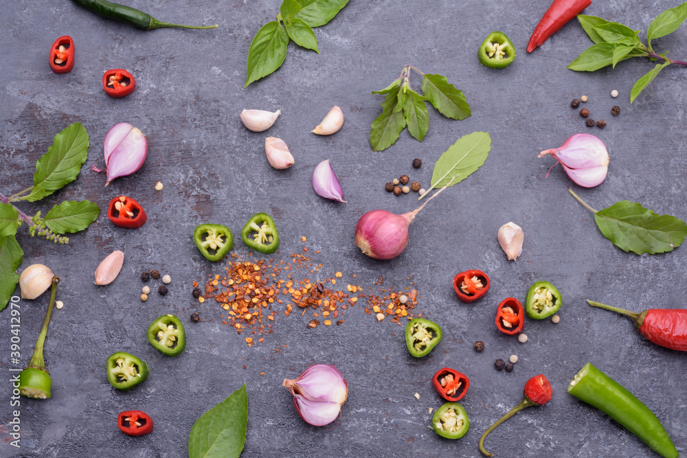 Red chili basil garlic Pepper and spices Placed on a black wooden table - top view.