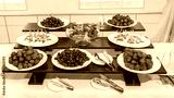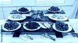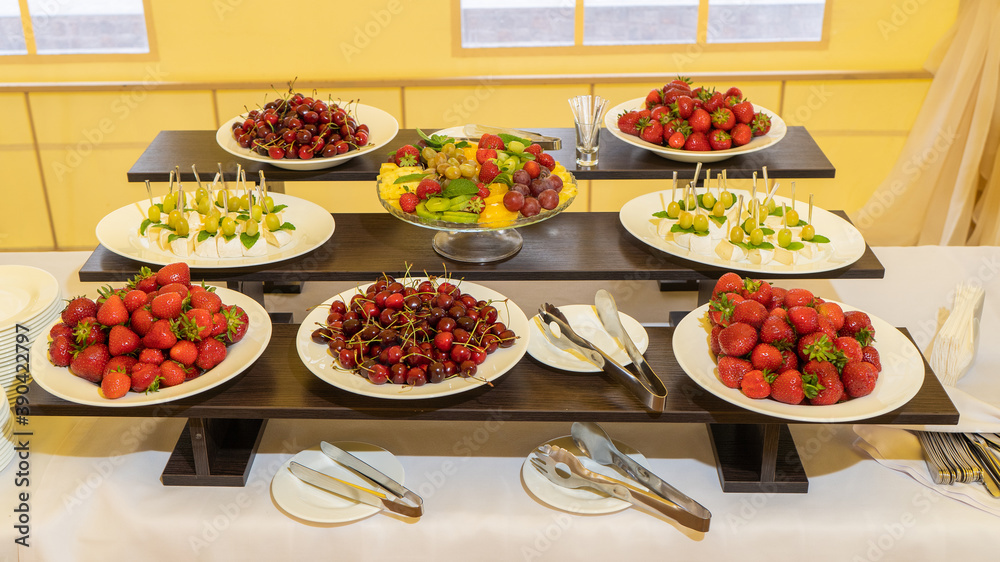 Closeup view photography of table full of white plates with different fresh fruits. Healthy catering for party concept.
