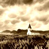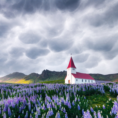 Lutheran Myrdal church surrounded by blooming lupine flowers, Vik, Iceland. Stormy sky with menacing mammatus clouds on background. Landscape photography