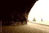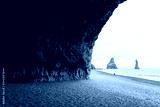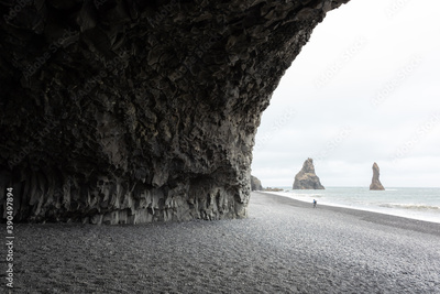 Incredible view on Black beach and Troll toes cliffs in cloudy weather. Lonely tourist with tripod going on coastline. Reynisdrangar, Vik, Iceland. Landscape photography